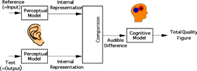 The underlying concepts of the proposed algorithms for perceptual measurement techniques are all quite similar. The common structure of these algorithms is depicted in the figure below. The process of human perception is modeled by employing a differential measurement technique which compares both, a reference signal (i.e. the "input" signal to a codec) and a test signal (i.e. the "output" signal of the codec). First, the algorithms process an ear model for the reference and the test signal, in order to calculate an estimate for the audible signal components. The result can be imagined as the "internal representation" inside the human auditory system. Comparing the internal representations of the reference, and the test signal leads to an estimate of the audible difference. To derive an overall quality figure, this information, which is a function of time, must be processed accordingly, like the human brain of a subject would do in a listening test. The respective part of processing within an algorithm is referred to as cognitive modeling. A total quality figure will be derived as the final result, which can be compared to a MOS ("Mean Opinion Score") resulting from a listening test.