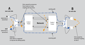 | OPTICOM’s Advanced ECHO algorithm determines the echoes with the help of long term correlations of the speech signals at a voice network’s input and output (see figure above). One advantage of using real voice signals over ordinary sine tones as other algorithms propose is that a voice signal is closer to the real world telephony situation. Sine tones might be treated more or less rigid by a network compared to real voice signals. For example echo cancellation devices employed in the network might be able to easily filter out detected sine tones but they might have difficulties handling a complex voice like signal. Using real speech signals for the measurement becomes even more valuable in digital e.g. VoIP networks, where signal delays increase due to the additional requirement for signal processing and without active echo cancellation methods or suppressors the echo signal would return to the talker annoyingly unattenuated. Another advantageous side effect is that through the speech signal’s natural modulation a best match of the two correlated signals can be found with higher accuracy than with sine tones. Therefore the results become more robust against clipping and noise. |