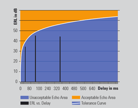 | The diagram below gives you an example of the results of a typical measurement with OPTICOM’s ECHO tool after the data was evaluated with a spread-sheet program. The diagram is divided into two distinct areas separated by an extrapolated and approximated talker echo tolerance curve derived from the ITU-T standard G.131. All echoes (peaks) that do not reach out of the blue area are generally likely to be perceived as annoying while all peaks that reach into the orange area are sufficiently attenuated and are tolerable if perceived at all. Here, easily three echo peaks can be identified which lie in the blue area of the diagram. These echoes are too loud to be negligible and are very likely to be perceived as annoying by a customer. |