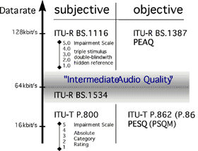 | > ITU-R BS.1387 "PEAQ" | Within the study period 1994 1998, the ITU-R had established task group 10/4 with the scope to recommend an objective, perception based model to evaluate the quality of wide-band audio codecs. After collecting a set of proposals, including the most popular ideas such as NMR, PAQM, PERCEVAL, POM and others, the group of model proponents, opted for a joint collaboration to derive an improved model. In 1998, two versions of this new model were presented: A 'Basic Version', featuring a low complexity approach, and an 'Advanced Version' for higher accuracy at the trade-off of higher complexity. After thorough verification, the model was recommended as a measure for the Perceptual Evaluation of Audio Quality 'PEAQ' under recommendation BS.1387 in late 1998 and revised in 2001. This set of standards, ITU-T P.861, ITU-T P.862 and ITU-R BS.1387, marks the development of state-of-the-art techniques for the objective evaluation of the perceived quality of audio codecs. All these techniques were derived from modeling the corresponding subjective experiment by an algorithm based approach. Thus it is essential to understand the scope of the modeled subjective experiment, when trying to interpret the calculated results. The following diagram summarizes the subjective test procedures and their corresponding objective counterparts in the context of typical bit rate limits. As mentioned earlier, the threshold between both worlds wide-band audio and telecommunication - is floating due to the steadily attempt to further reduce the bit rates by more efficient coding schemes. Consequently, the overall data rate scale depicted in the figure should be taken as a course indicator only. |