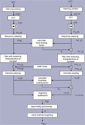 The detailed block diagram shows how to calculate PSQM. In the first step, the time domain representations of both input signals, x and y are transformed to the frequency domain. This transformation is accomplished by selecting blocks of the input samples that are input to an FFT. A Hann window is applied. The (linear) frequency scale is transformed to a pitch scale ("frequency warping"). The pitch modeling is also often referred to as "Bark transformation". Both, the reference, and the test signal are then filtered with the transfer characteristics of the receiving device (e.g. handset, loudspeaker, or headphones). A "Hoth noise" signal is added to simulate the background noise present in a typical office environment. The objective is to take into account the masking effects of real world environment noise, to properly model a masked threshold. The subsequent process of "intensity warping" leads to a representation of a compressed loudness as a function of pitch and time. By subtracting the two signal representations, an estimate of the audible error is derived. The difference signal is - of course - still a function of pitch and time.